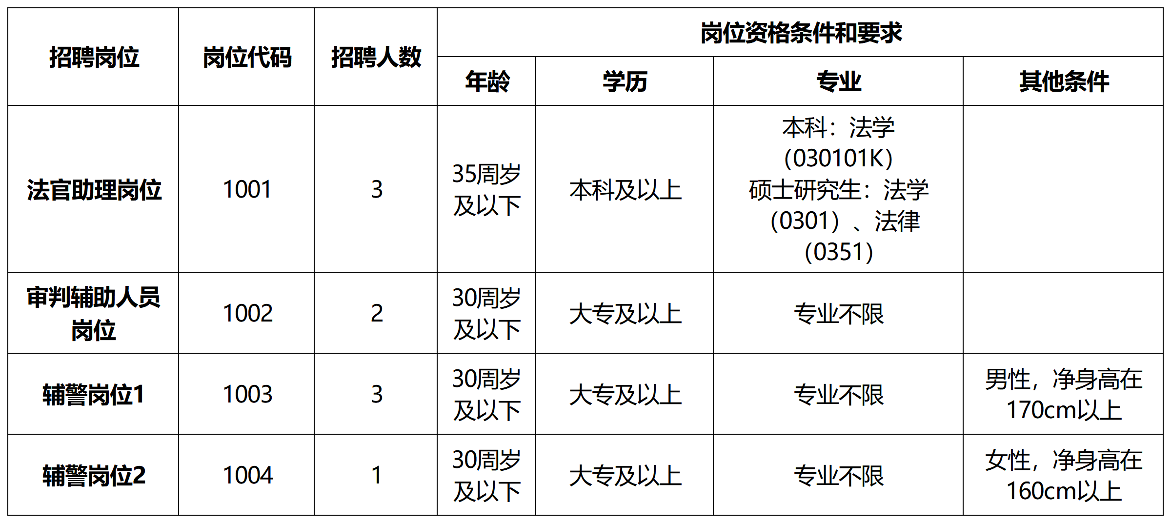 3.新聘人員試用期為1個(gè)月,試用期滿合格后簽訂勞動(dòng)合同。本次招聘的工作人員,法官助理崗位(1001崗)每人每年12萬元左右(含社會(huì)保險(xiǎn)、公積金和工會(huì)福利等費(fèi)用);審判輔助人員崗位(1002崗)和輔警崗位1(1003崗)、輔警崗位2(1004崗)每人每年6.3萬元左右(含社會(huì)保險(xiǎn)、公積金和工會(huì)福利等費(fèi)用)。