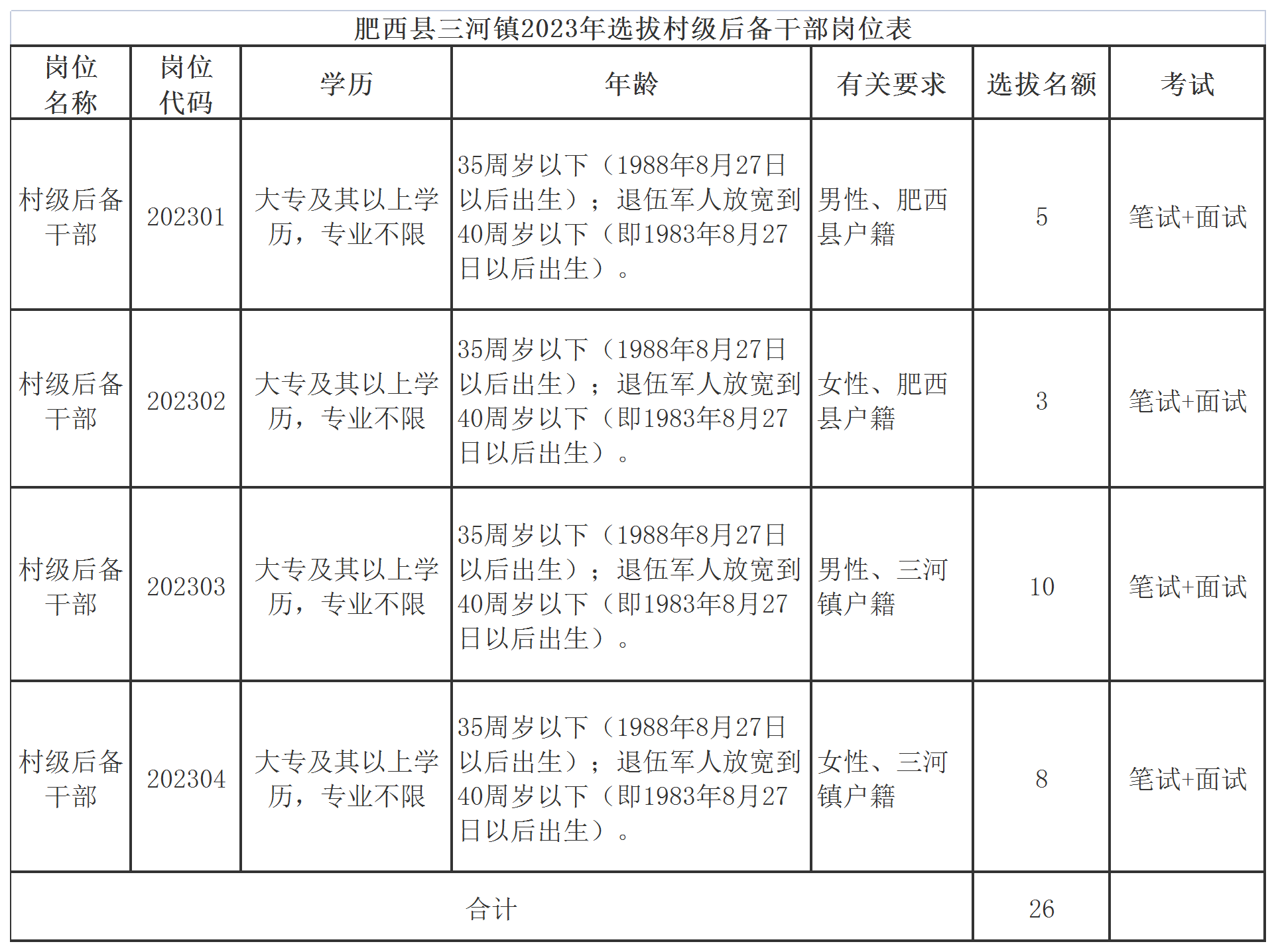 計劃選拔26名村級后備干部,其中肥西縣戶籍8名,三河鎮(zhèn)戶籍18名。詳見附表。