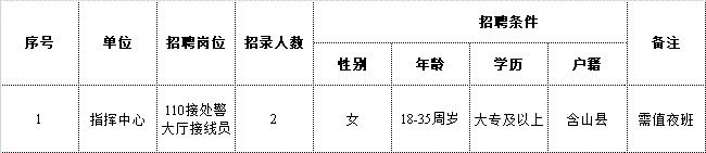 2020-08-24 15:48:08閱讀()含山縣人民政府因工作需要,含山縣公安局現(xiàn)擬向社會公開招聘2名警務(wù)輔助人員,現(xiàn)將招聘事項公告如下: