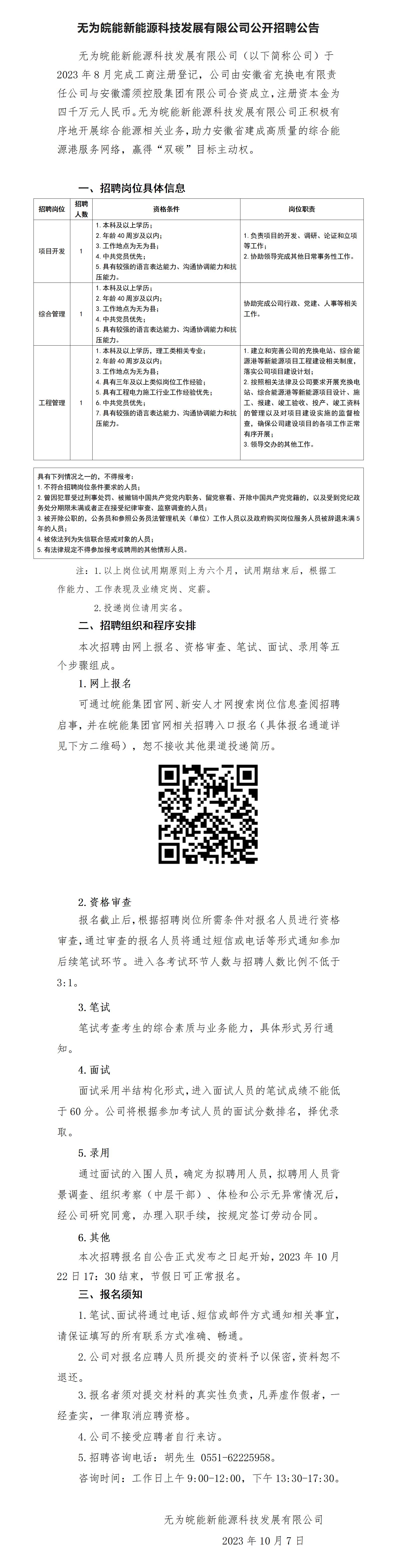 2023年蕪湖無為皖能新能源科技發(fā)展有限公司公開招聘公告