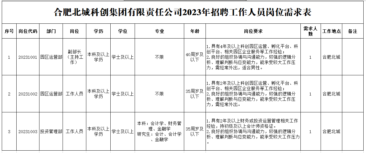 2023年合肥北城科創(chuàng)集團(tuán)有限責(zé)任公司招聘工作人員公告