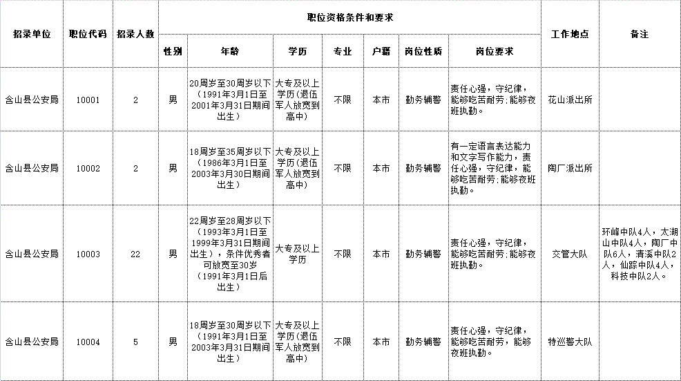 2021年馬鞍山市公安局含山片區(qū)招聘警務(wù)輔助人員職位表